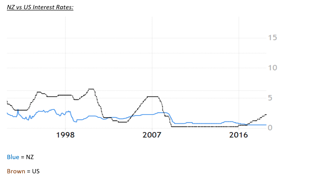 On the other side of the equation, we’ve seen the US interest rise rapidly in the past two years from 0.25 to 2.25%. This has increased demand for the USD given a stronger yield, pushing the NZD down in the process.