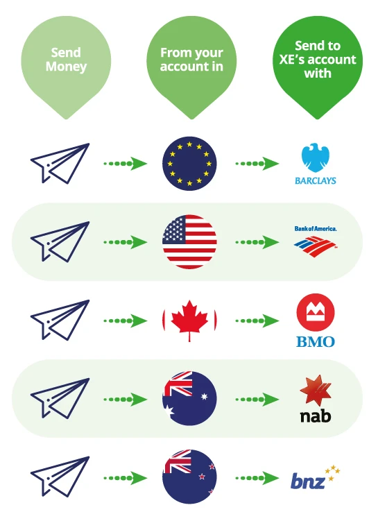 Once you have booked your transfer, you must send the funds to XE from a bank somewhere in the world. Depending on where you’re sending money from, here is some quick guidance on which bank to select.
