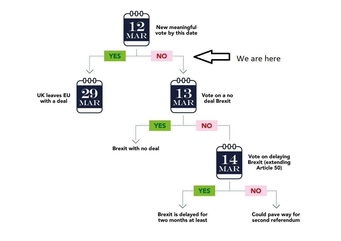 The UK parliament has just voted down Prime Minister May’s Brexit latest withdrawal agreement. They will be another vote on Wednesday on whether to leave the EU without a deal, otherwise known as a "hard Brexit". If that fails, parliament will vote on Thursday on whether to extend the Brexit deadline, or possibly hold another referendum.
