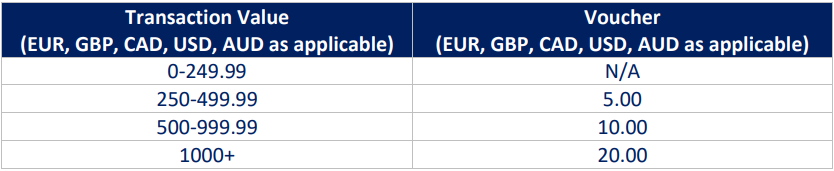 Receive a gift card of your choice via email within 14 working days of your first transfer.